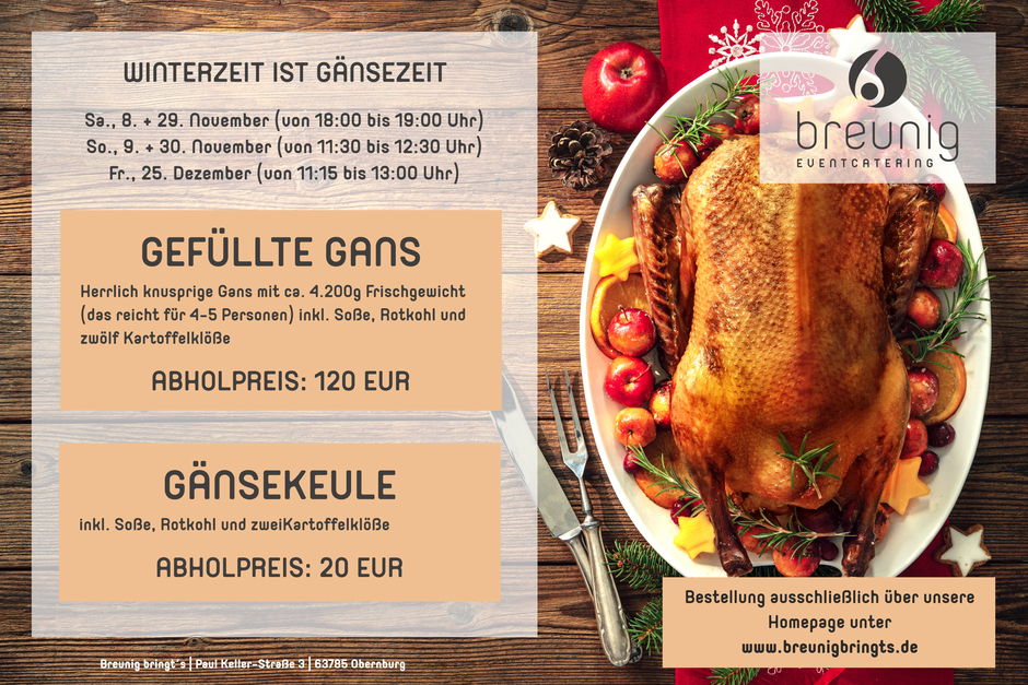 Hinweis: Wir bitten um Verständnis, dass wir am 25.12.2025 Gänsekeulen erst ab einer Stückzahl von vier anbieten können. Möchten Sie zu einer gefüllten Gans zusätzlich 1-3 Gänsekeulen mit Beilagen haben, ist dies selbstverständlich möglich. Bitte geben Sie dies einfach vor Bestellabschluss im Kommentarfeld mit an.